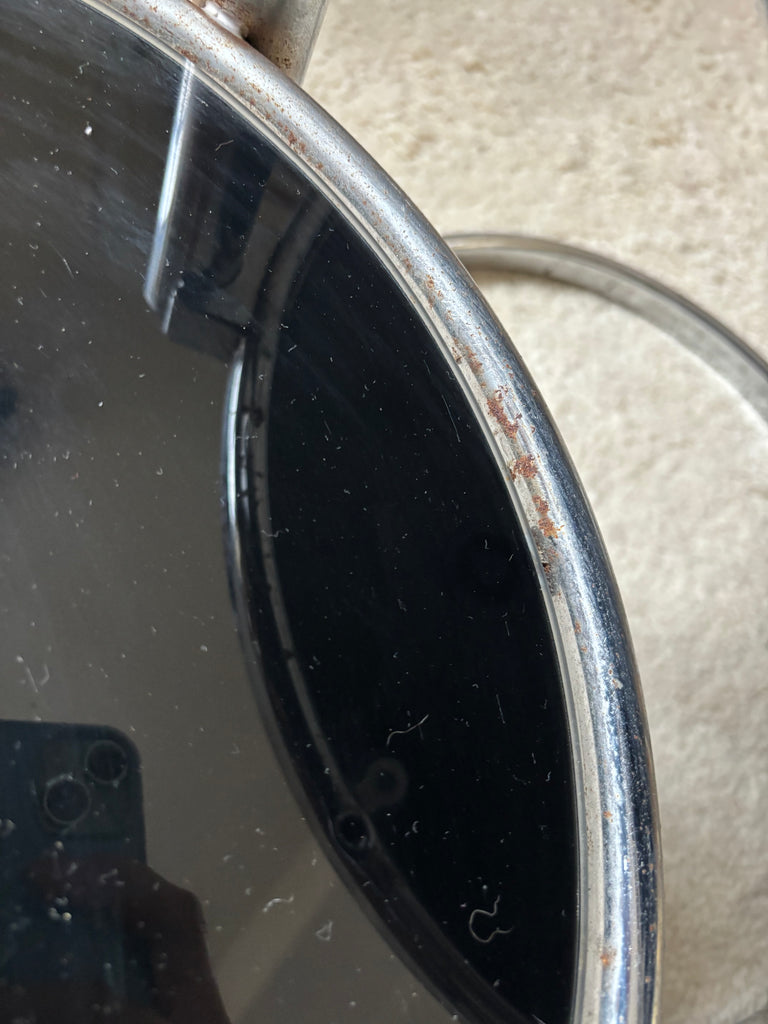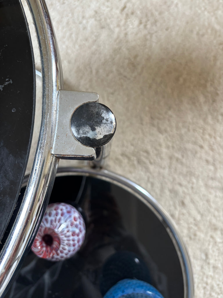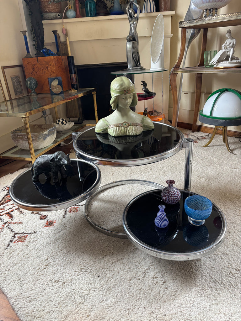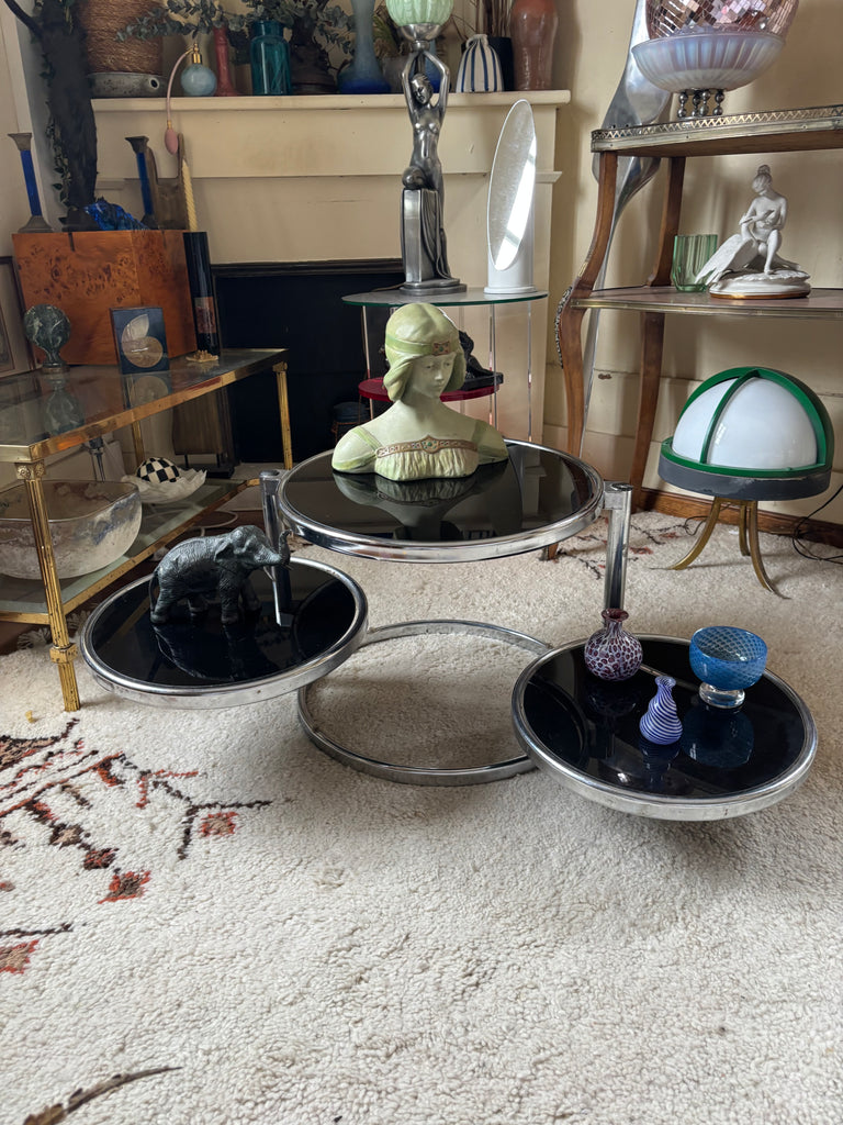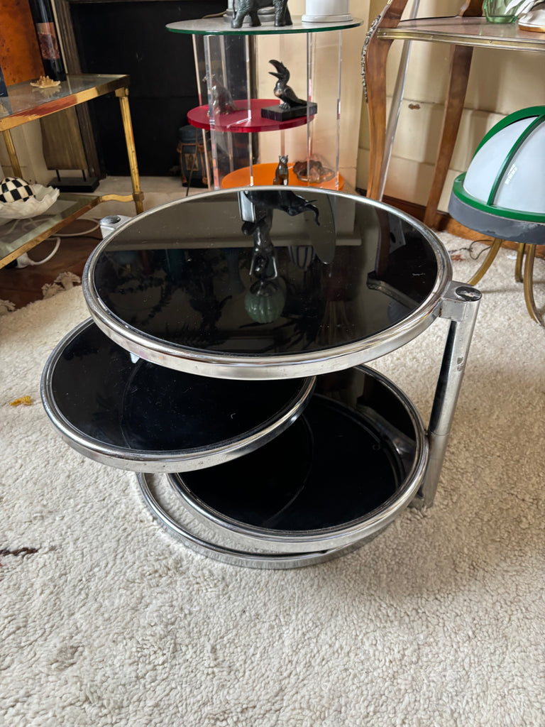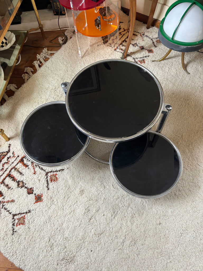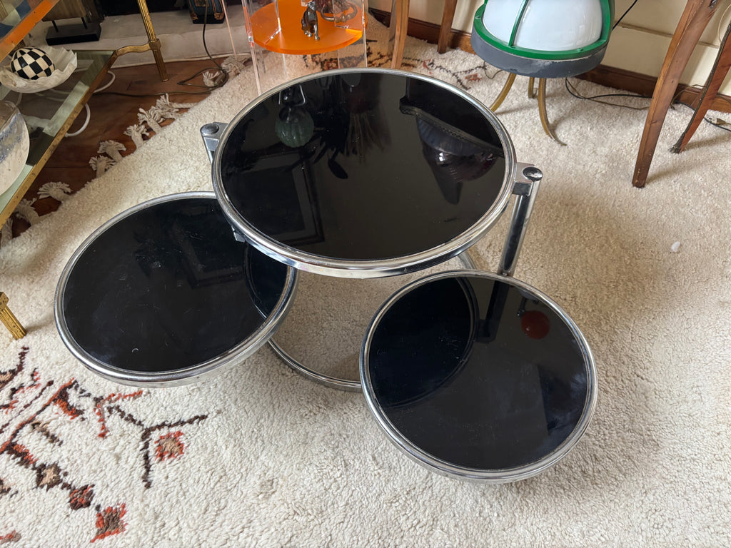 Superbe petite table basse ou d’appoint vintage proposant 3 plateaux ronds en verre fumé noir sur piètement chromé argenté.