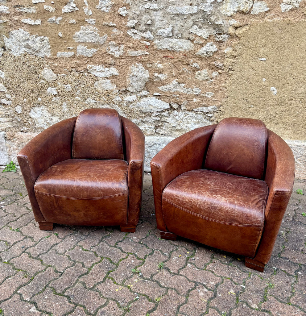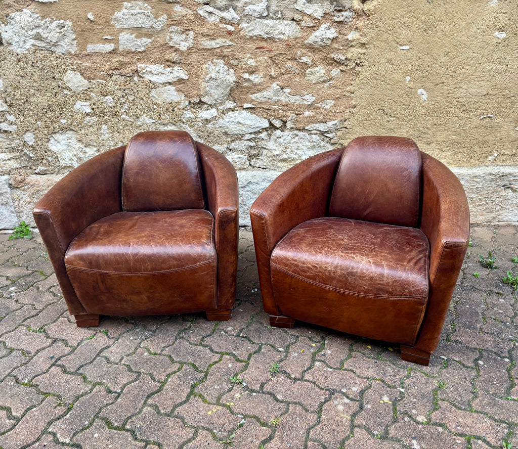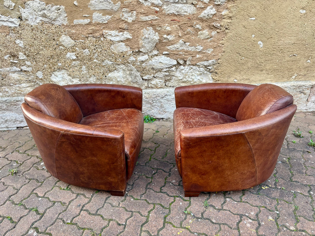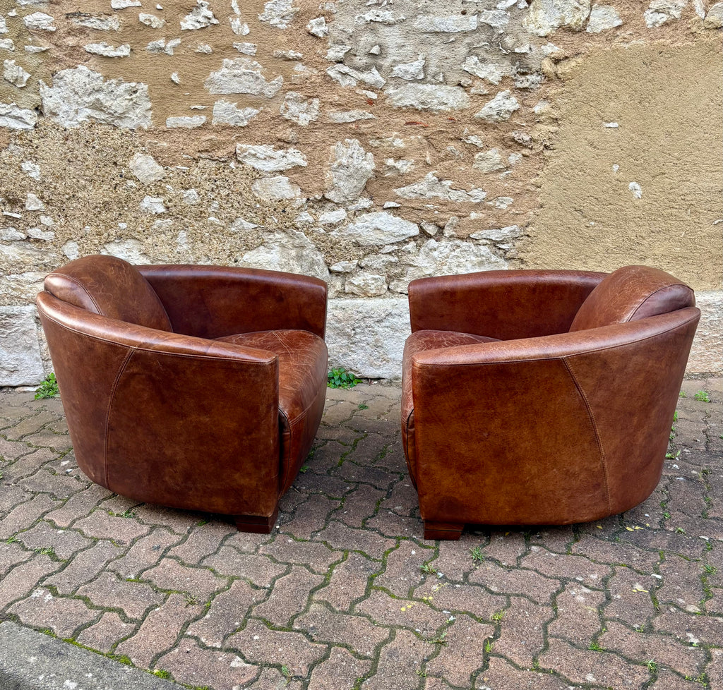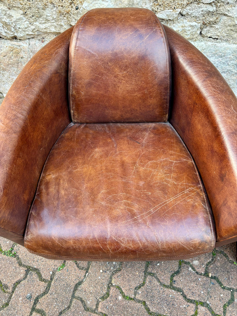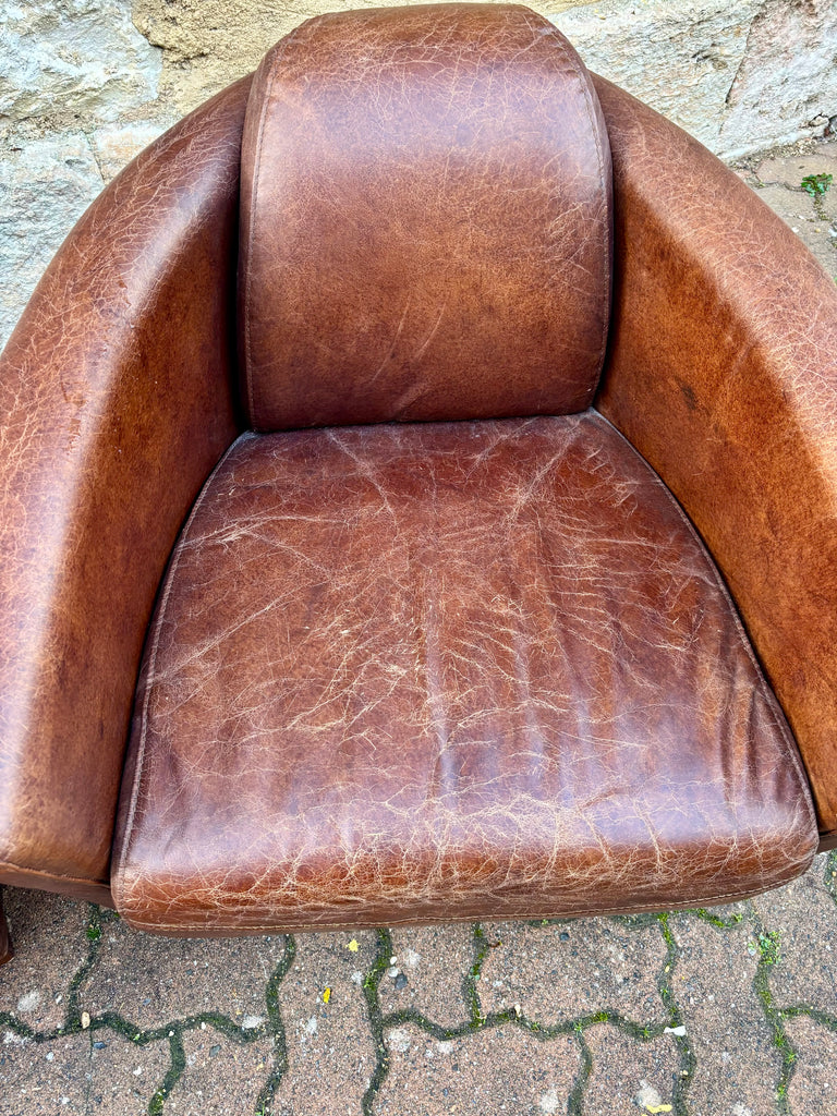 Solidement conçu autour d'une structure en hêtre, ce fauteuil en cuir possède une assise profonde. Ses accoudoirs et son dossier bombé épousent parfaitement le dos pour assurer un très grand confort.