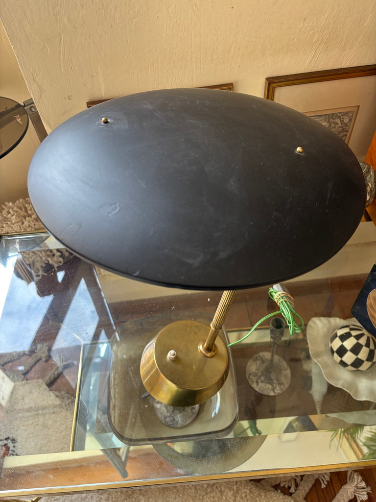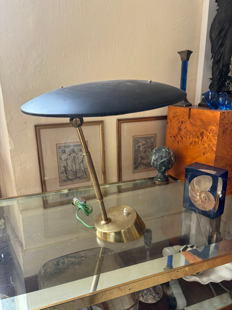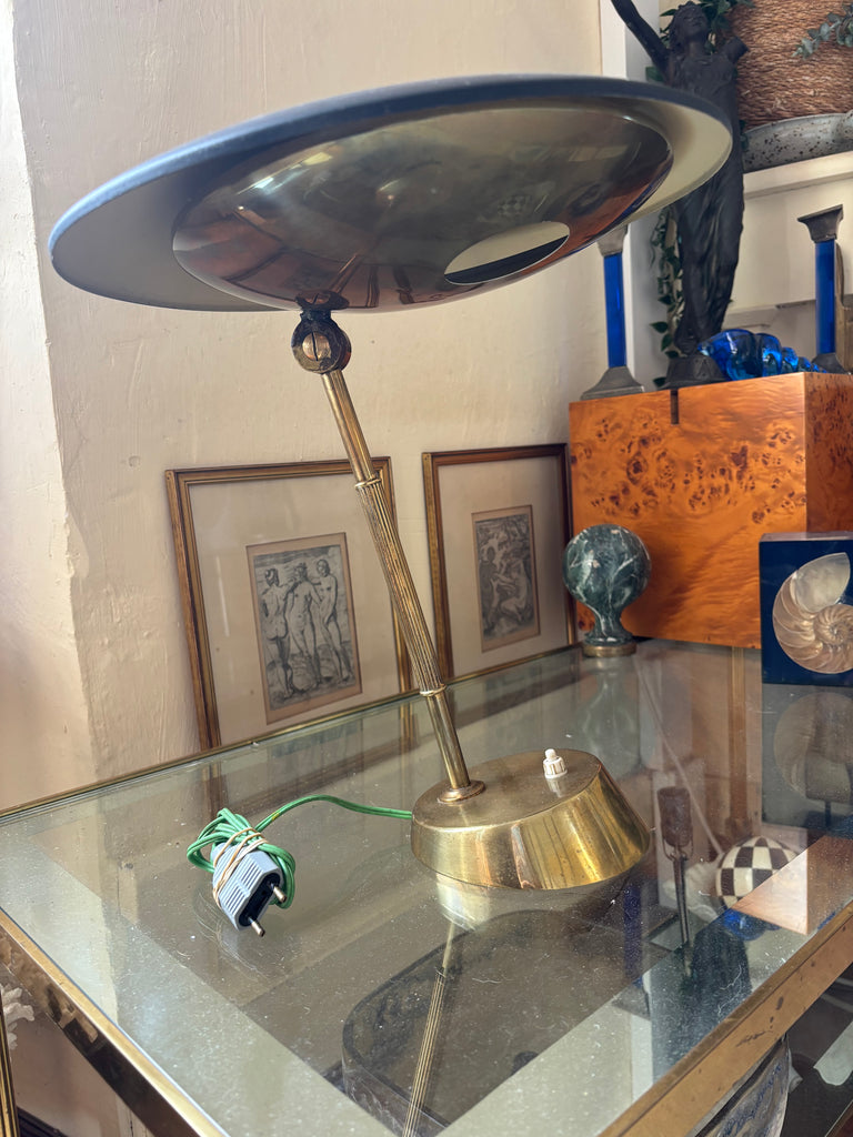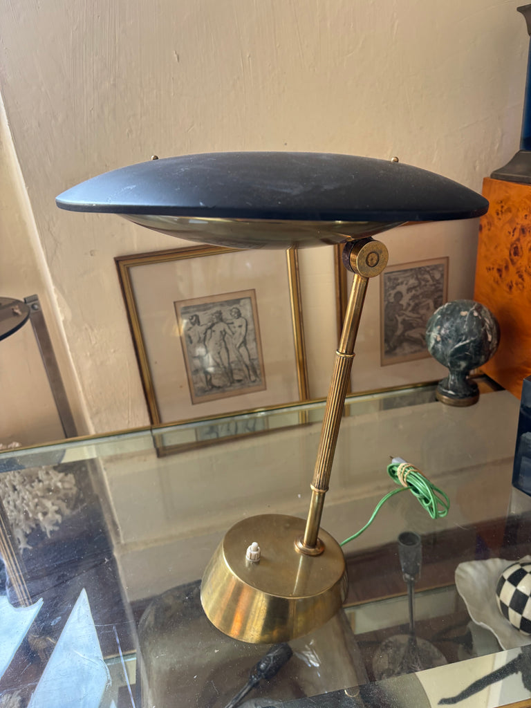 Magnifique lampe de bureau vintage, typique des annĂ©es 1950/60, mĂȘlant lâĂ©lĂ©gance de laiton patinĂ© et un abat-jour large en mĂ©tal noir laquĂ©.