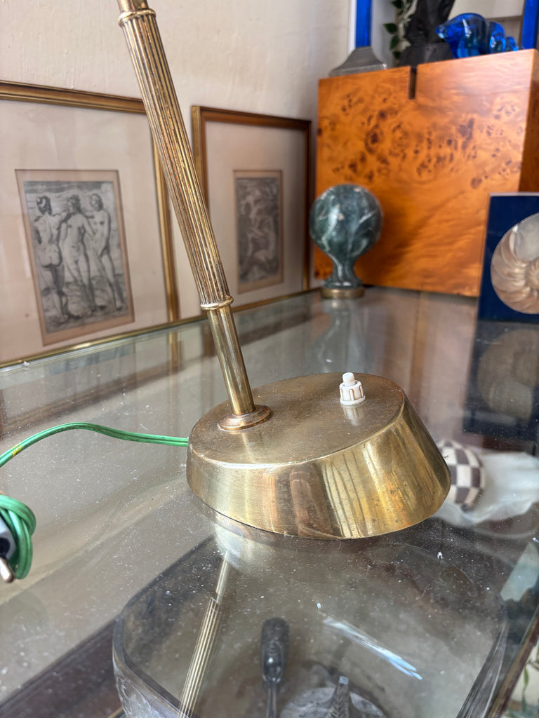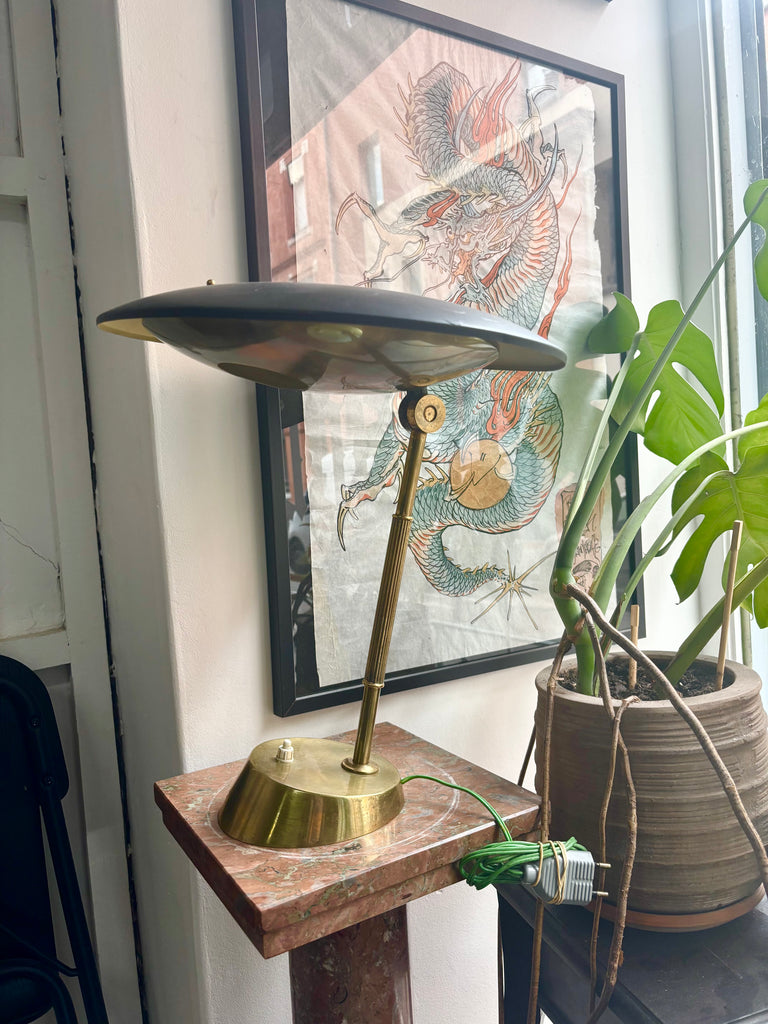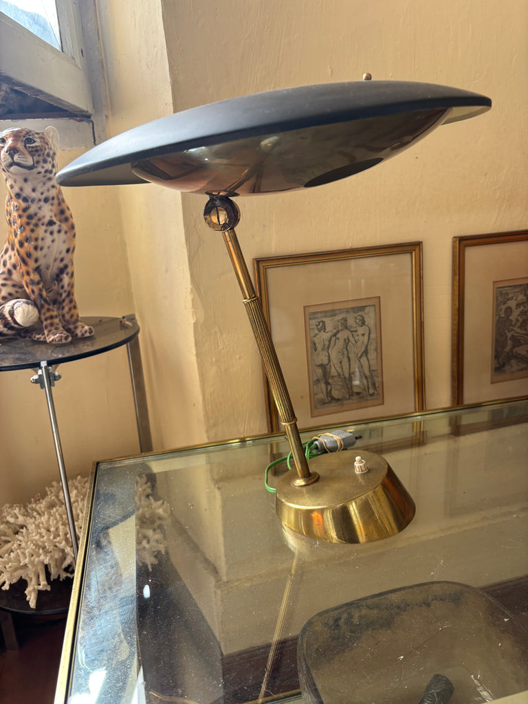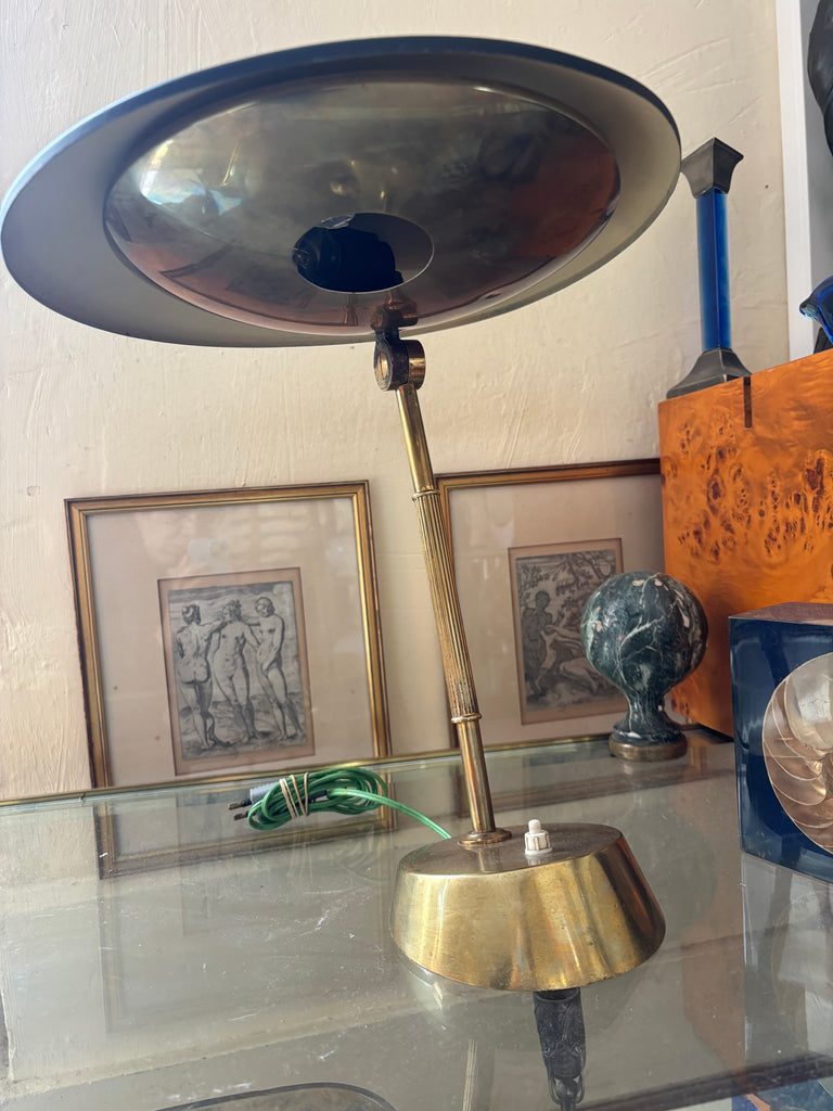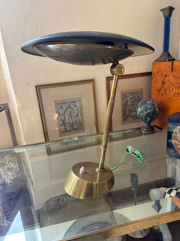 Magnifique lampe de bureau vintage, typique des annĂ©es 1950/60, mĂȘlant lâĂ©lĂ©gance de laiton patinĂ© et un abat-jour large en mĂ©tal noir laquĂ©.