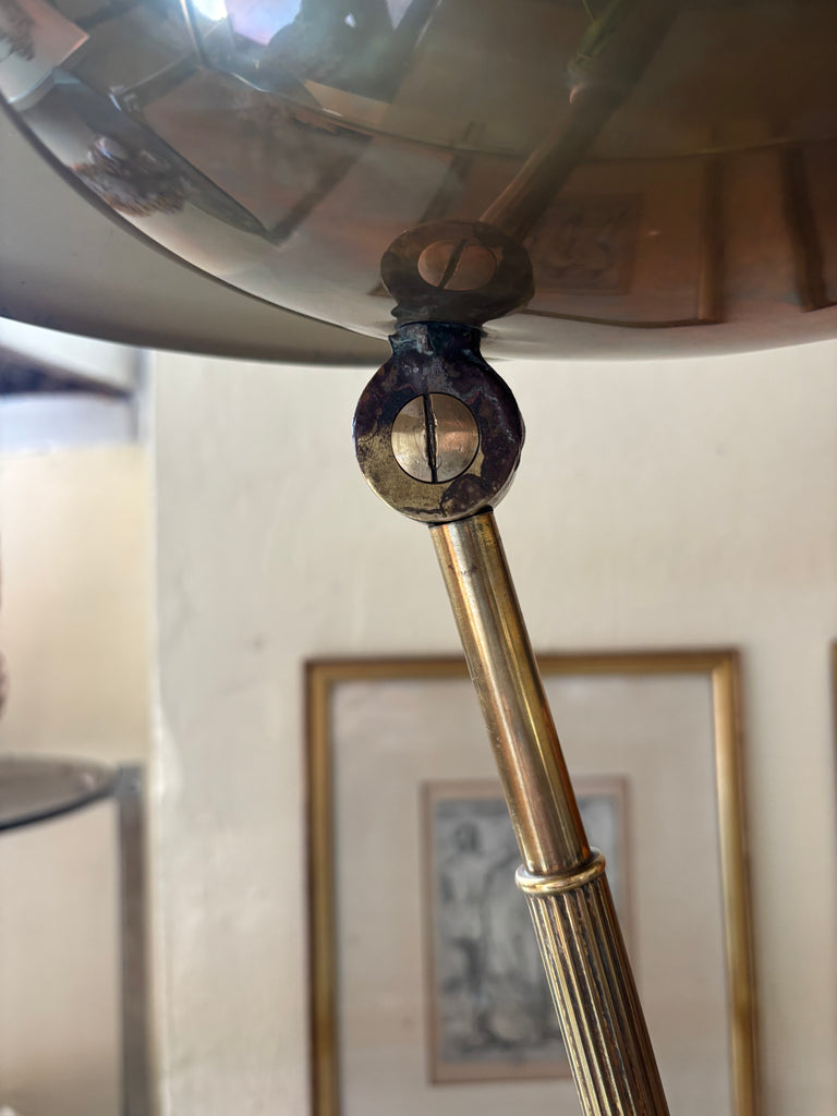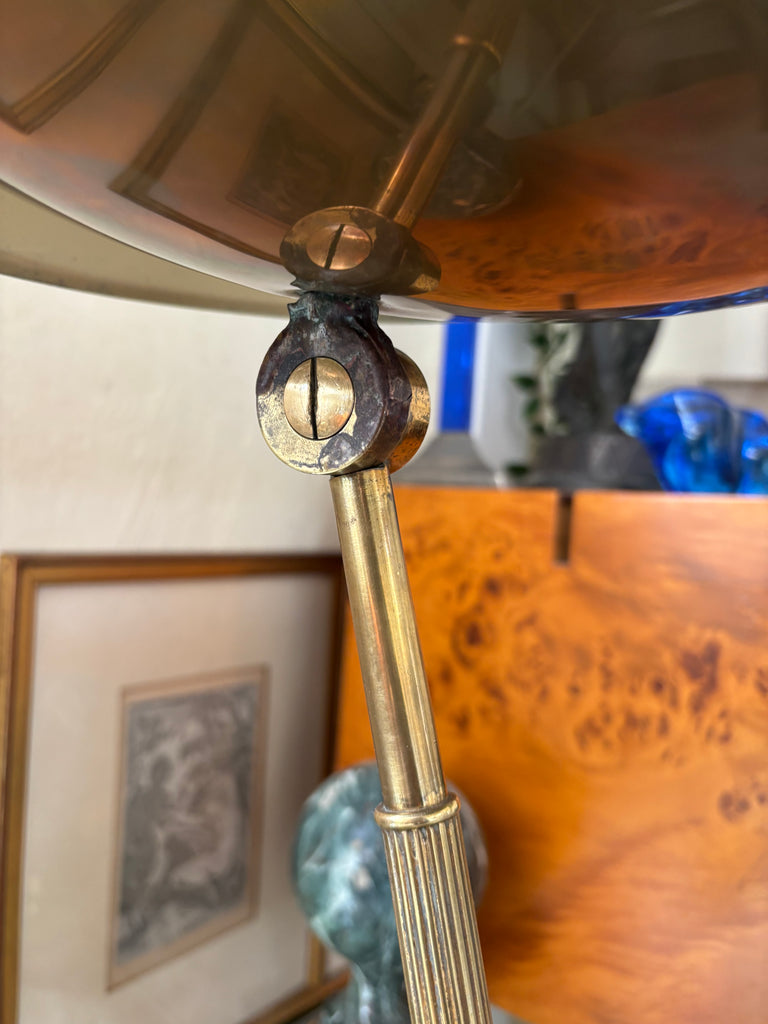 Le pied, fin mais solide, sâĂ©lĂšve depuis un socle trapĂ©zoĂŻdal en laiton, pour sâarticuler jusquâau diffuseur ; bel Ă©quilibre entre fonctionnalitĂ© et esthĂ©tique sculpturale.