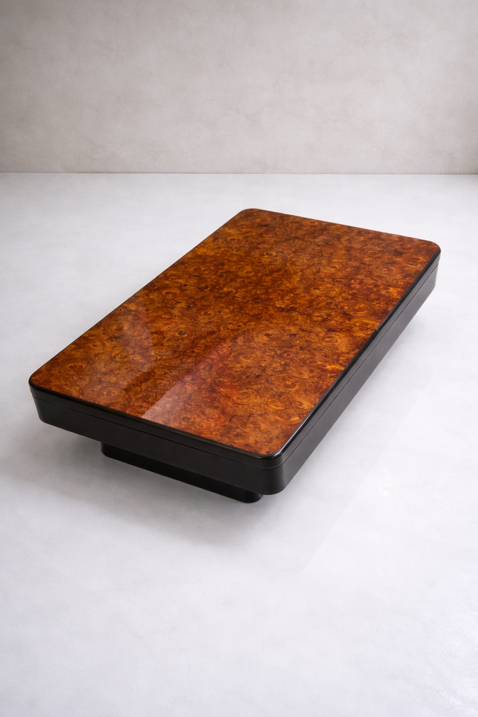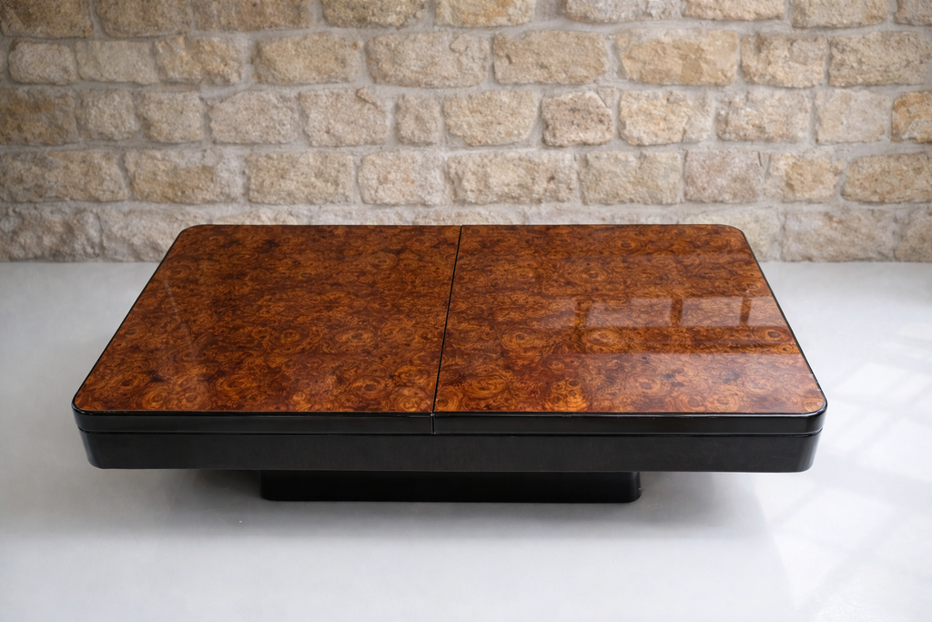 Le contraste entre la richesse du placage de loupe et la base noire laquée confère à cette pièce une présence très chic et caractéristique du style luxueux de Willy Rizzo.