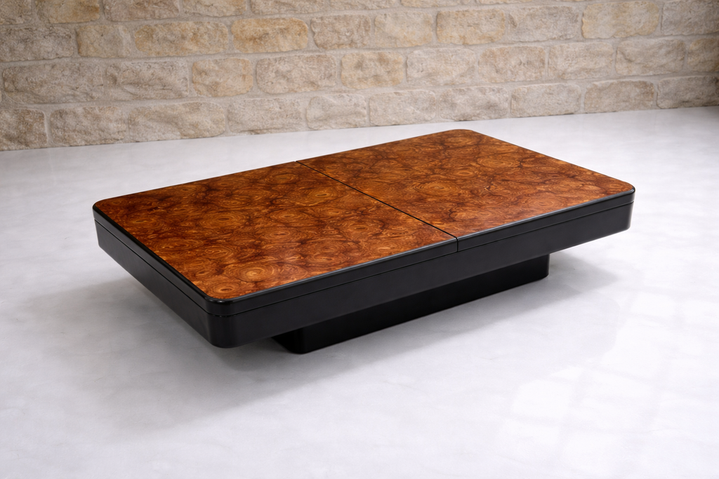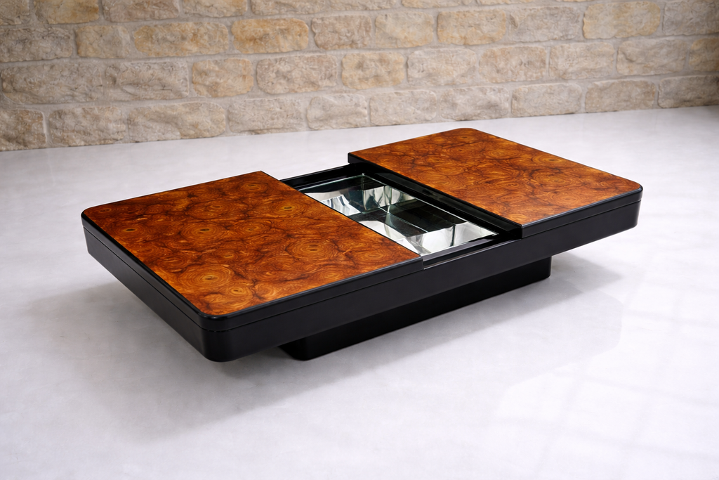 À la fois fonctionnelle et décorative, cette table se transforme en véritable bar dissimulé, pièce signature des intérieurs sophistiqués des années 70.