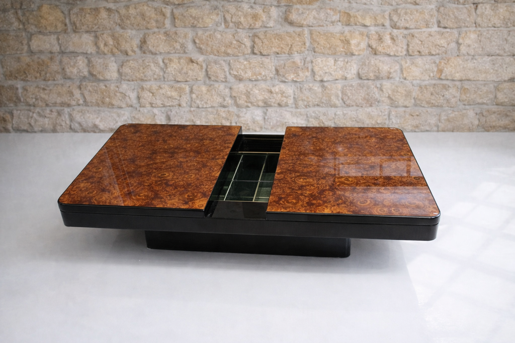 Cette élégante table basse rectangulaire présente un magnifique plateau en placage de loupe de bois aux reflets ambrés profonds, sublimé par une finition brillante. Le plateau s’ouvre en deux parties par les extrémités pour révéler un espace bar intérieur entièrement habillé de miroirs, offrant un rangement raffiné pour verres et bouteilles.