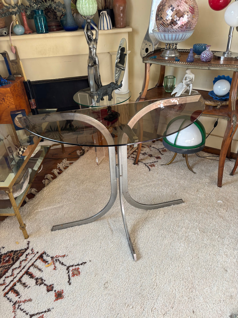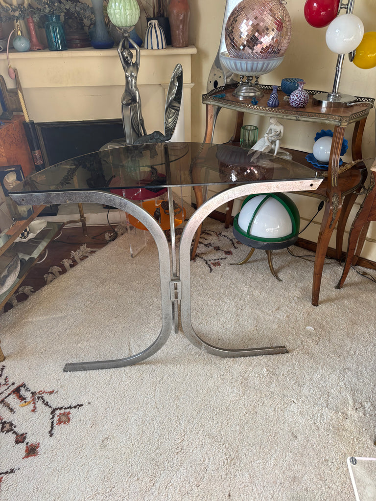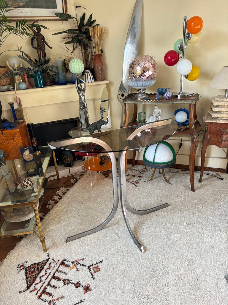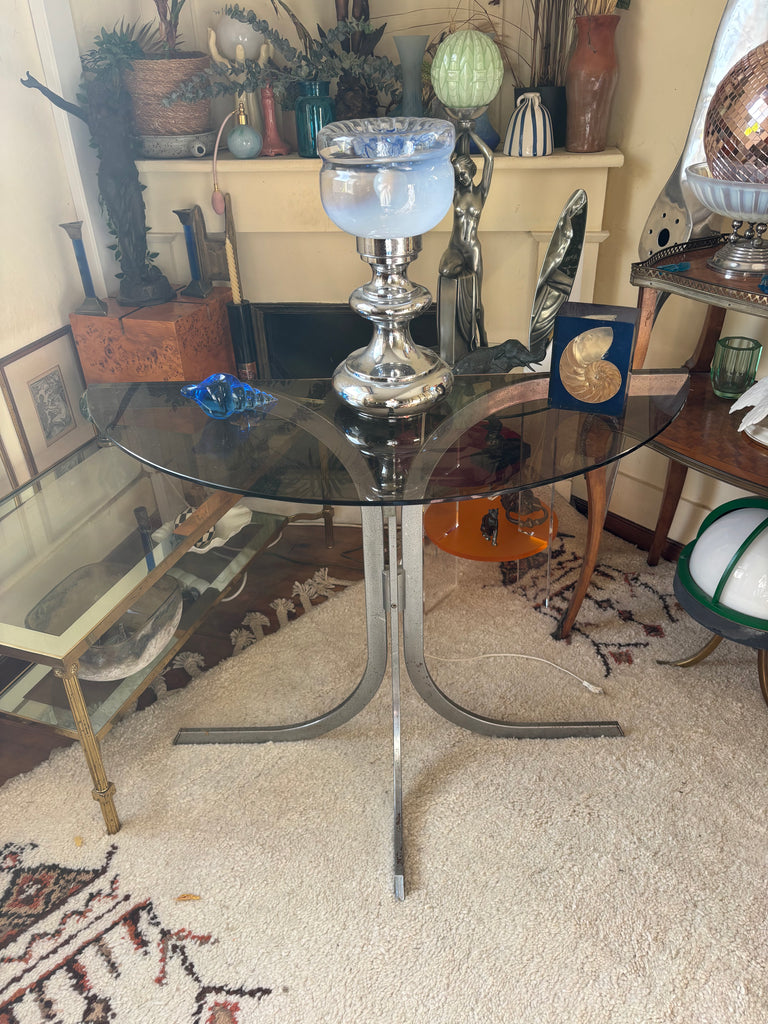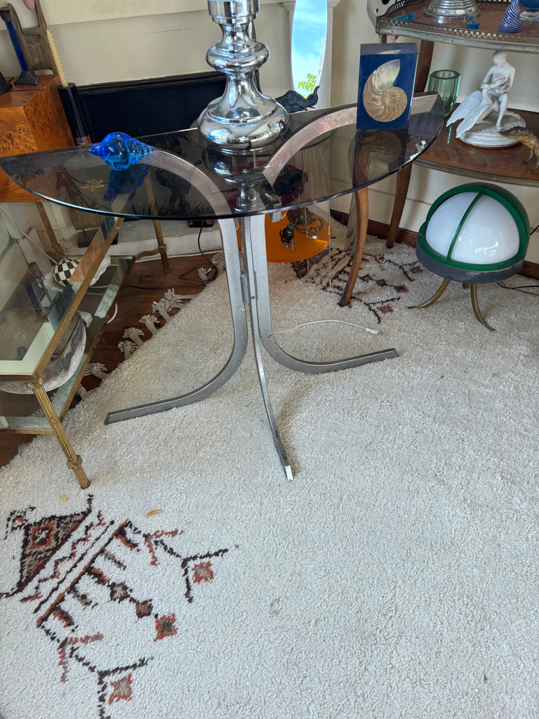 Structure métal chromé, plateau verre fumé.