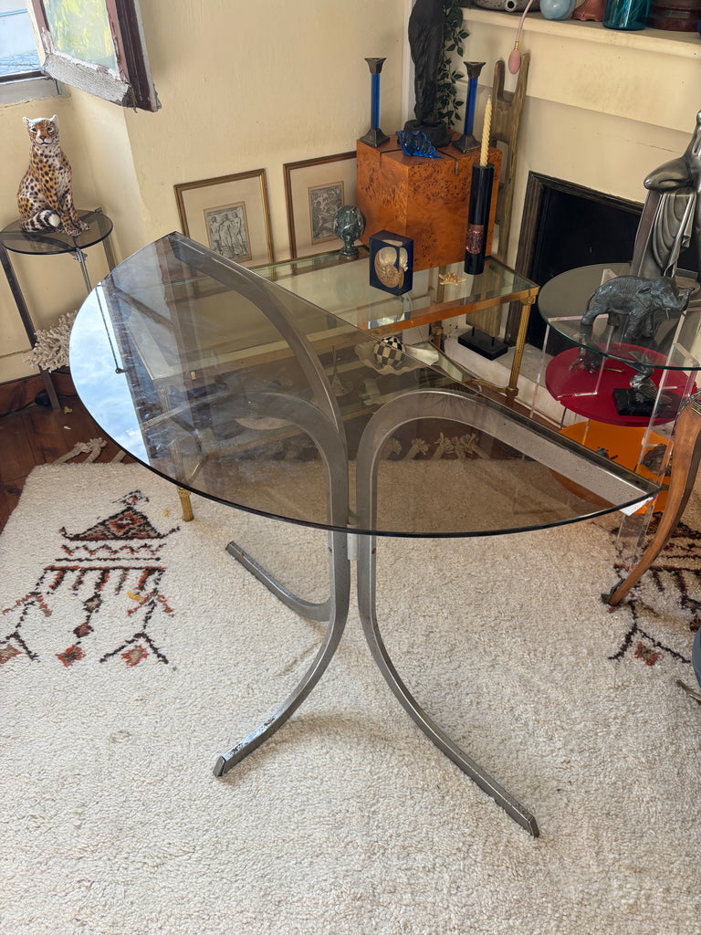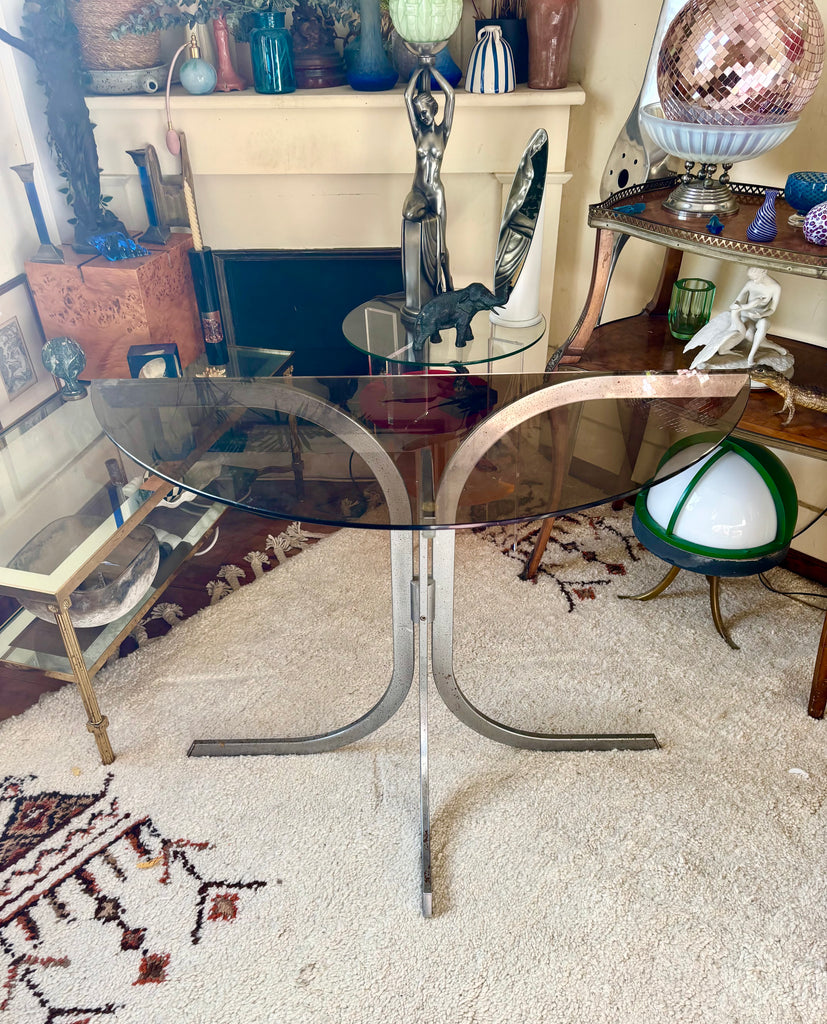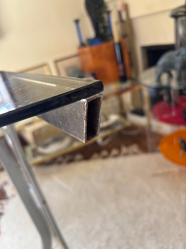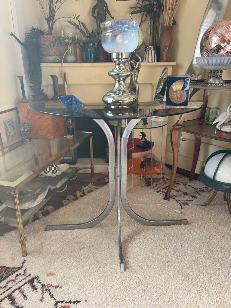 Structure métal chromé, plateau verre fumé.
