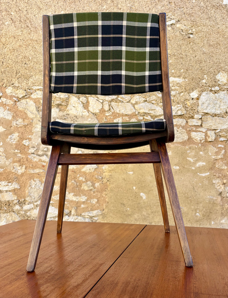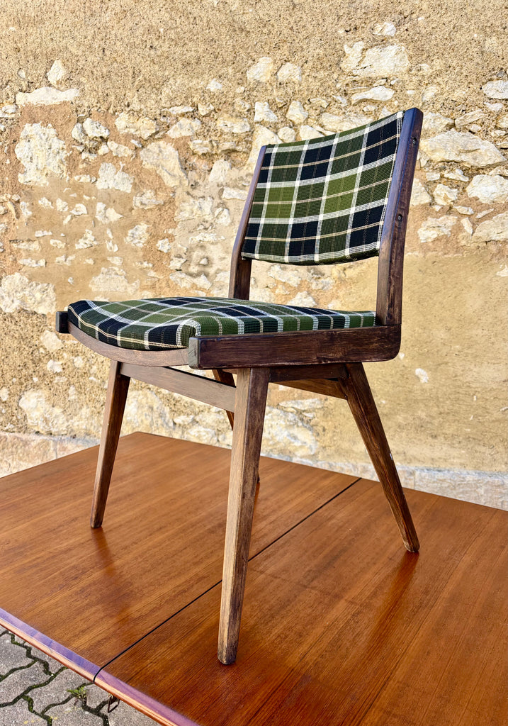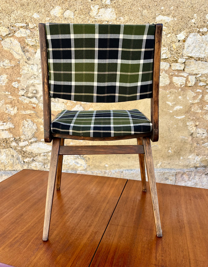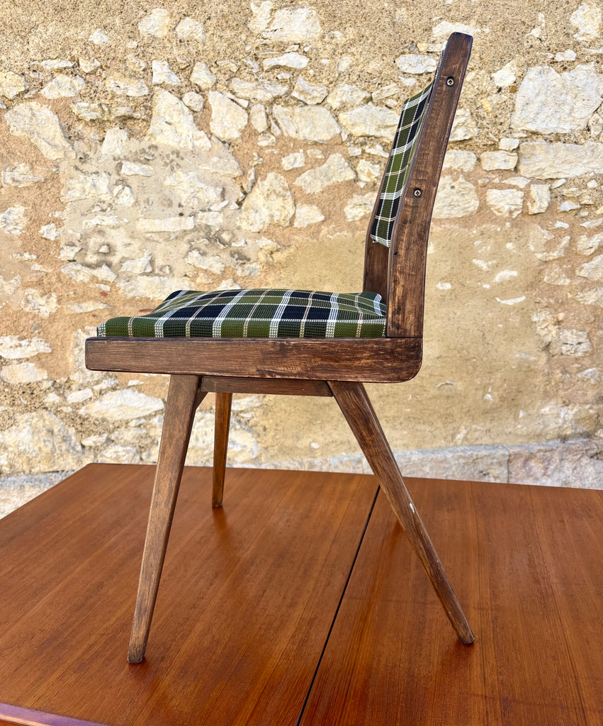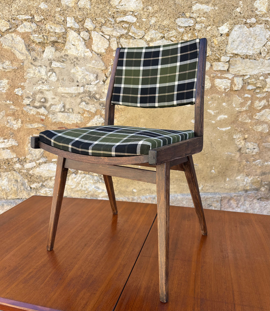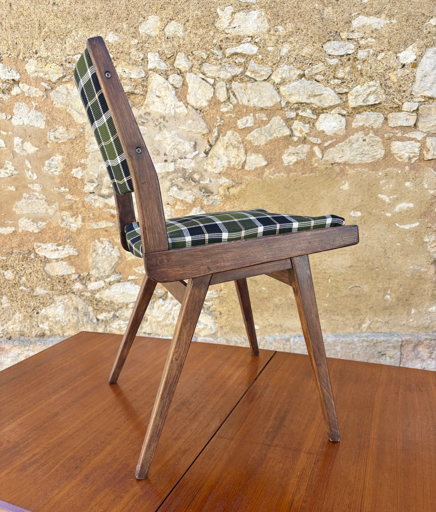 D’après mes recherches elle semble correspondre au modèle attribué à Maurice Pré, structure en hêtre massif, dossier et assise en tissu façon tartan écossais retapisse à neuf.