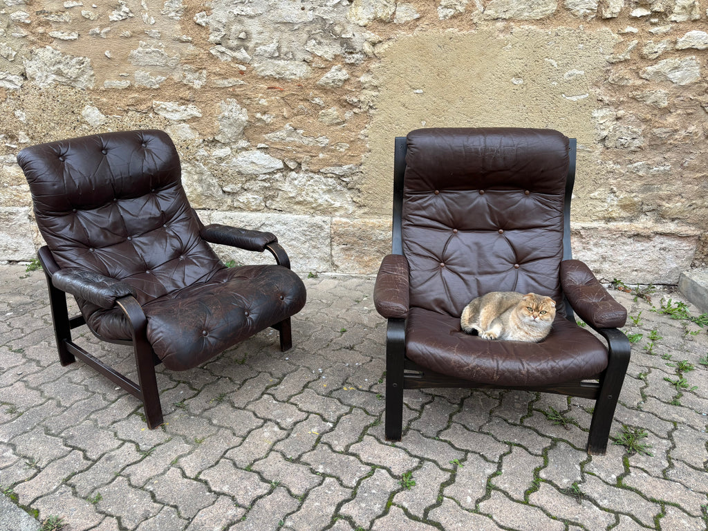 Possibilité de faire l’acquisition de trois fauteuils scandinaves, le modèle est le même pour une paire, et differe légèrement pour l’un d’entre eux.