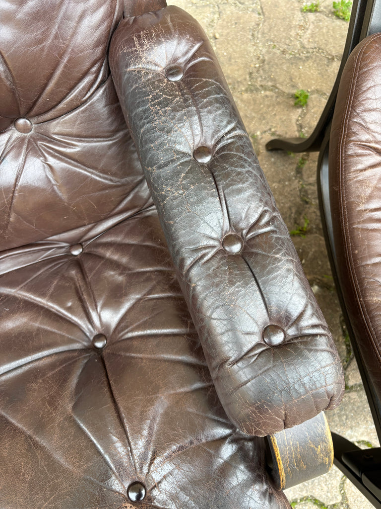 Etat : le fauteuil à vécu, le cuir est craquelé dans son ensemble et mériterai un gros nourrissage de fond. A adopter en l’état! Il n’en demeure pas moins des plus confortables. Qualité exceptionnelle de l’assise, large et stable, faites pour durer dans le temps.