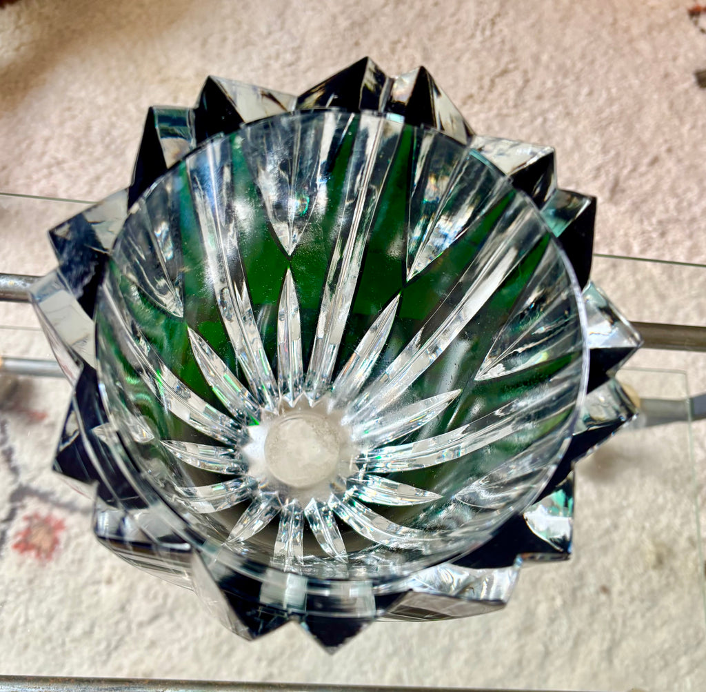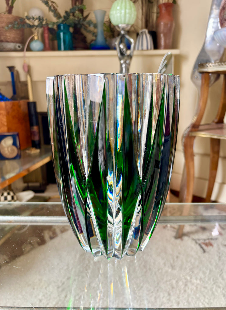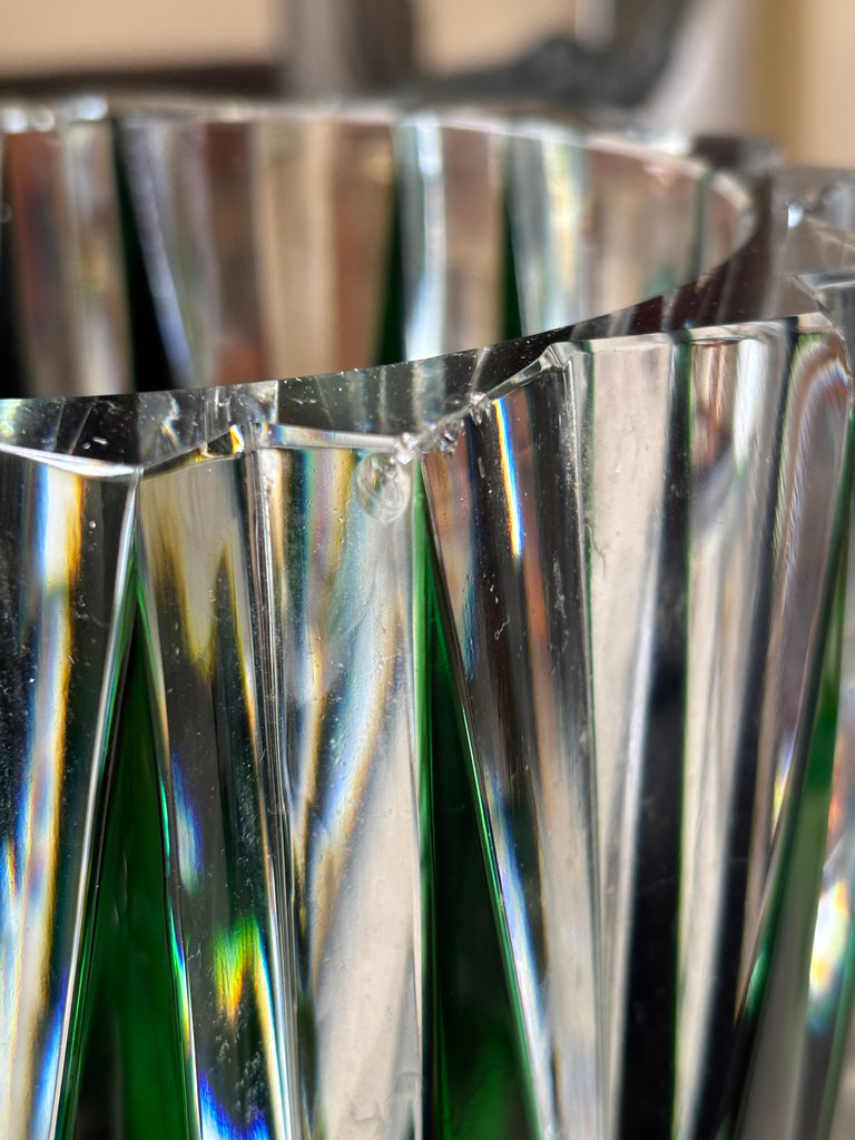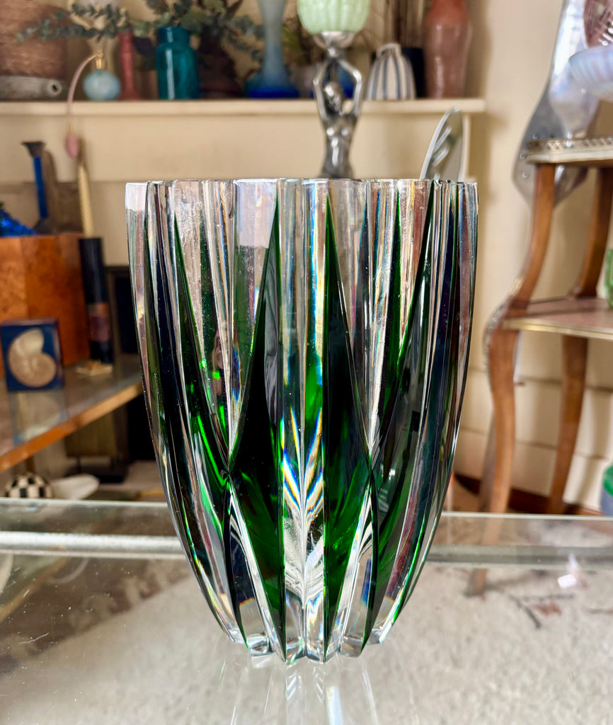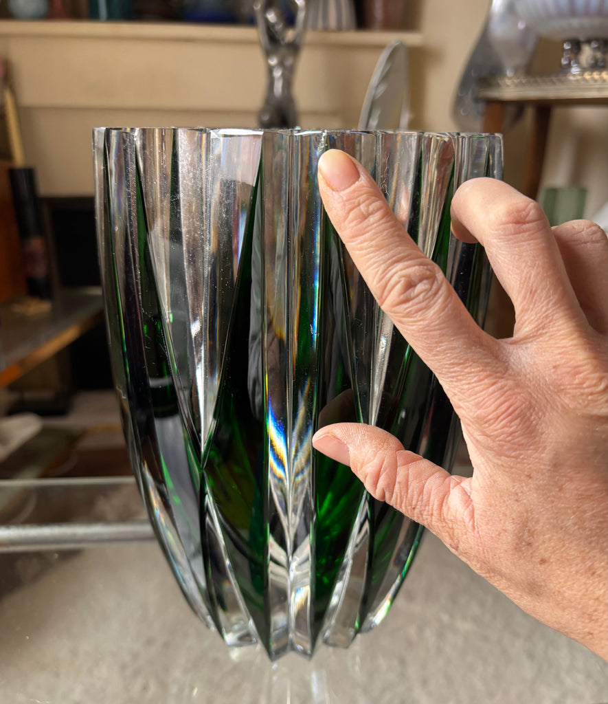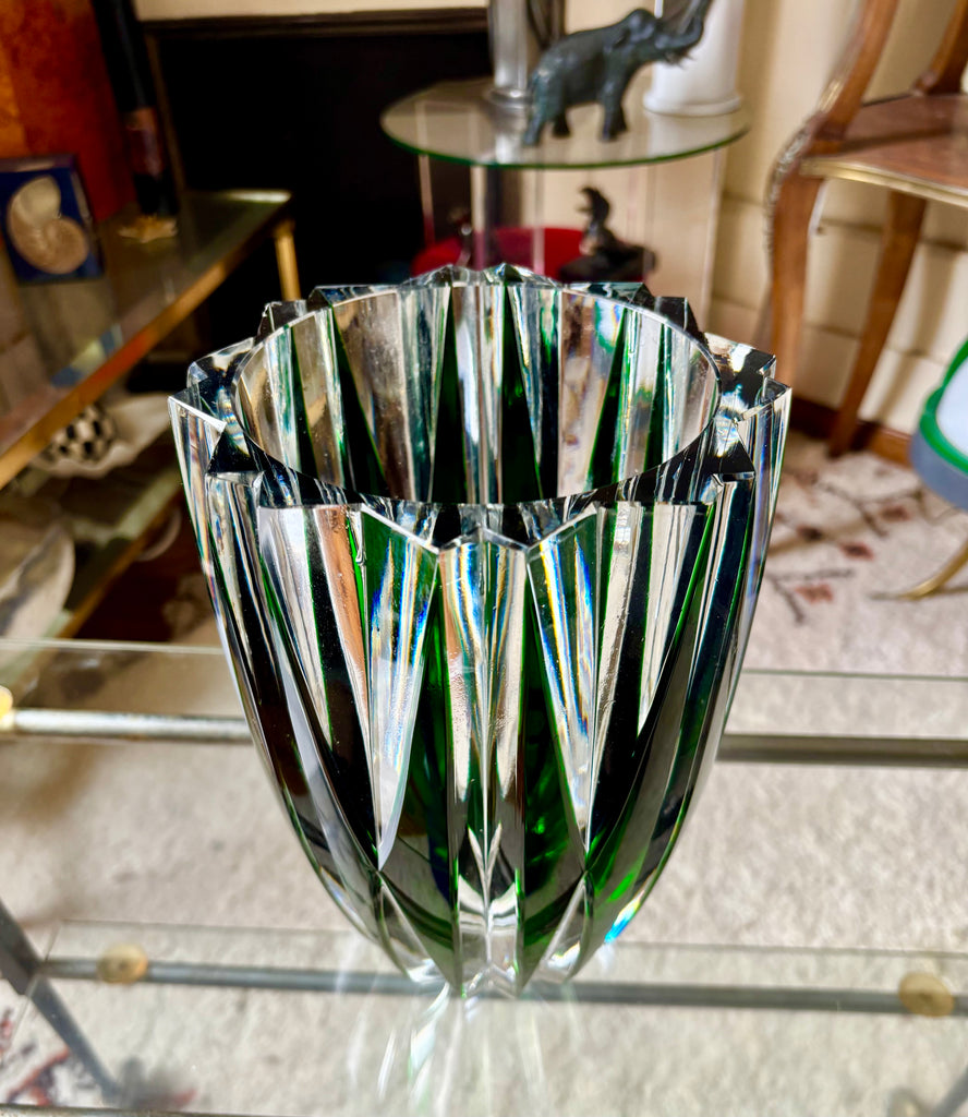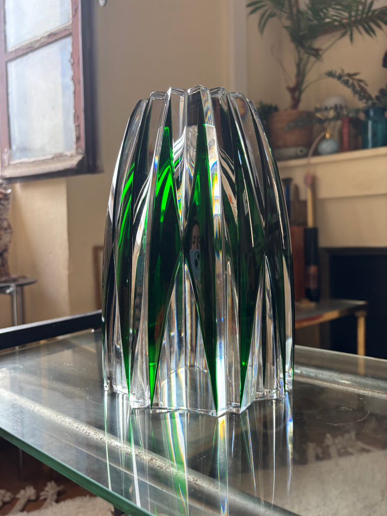 Ce grand vase (24cm de hauteur et poids conséquent, gage de qualité et de stabilité) à la fois moderne et intemporel, présente un superbe jeu de facettes verticales qui capte et reflète la lumière avec élégance. Sa teinte vert émeraude profond associée à la transparence du cristal crée un effet visuel saisissant.