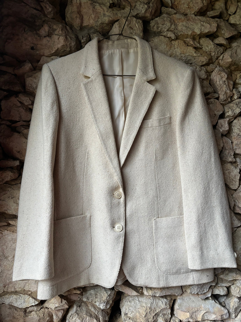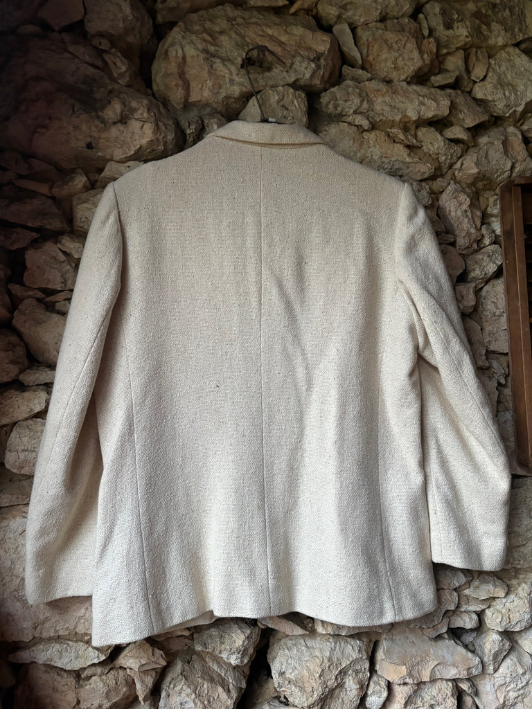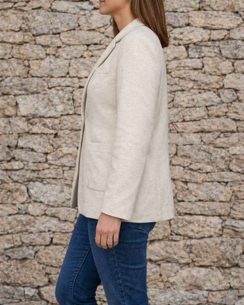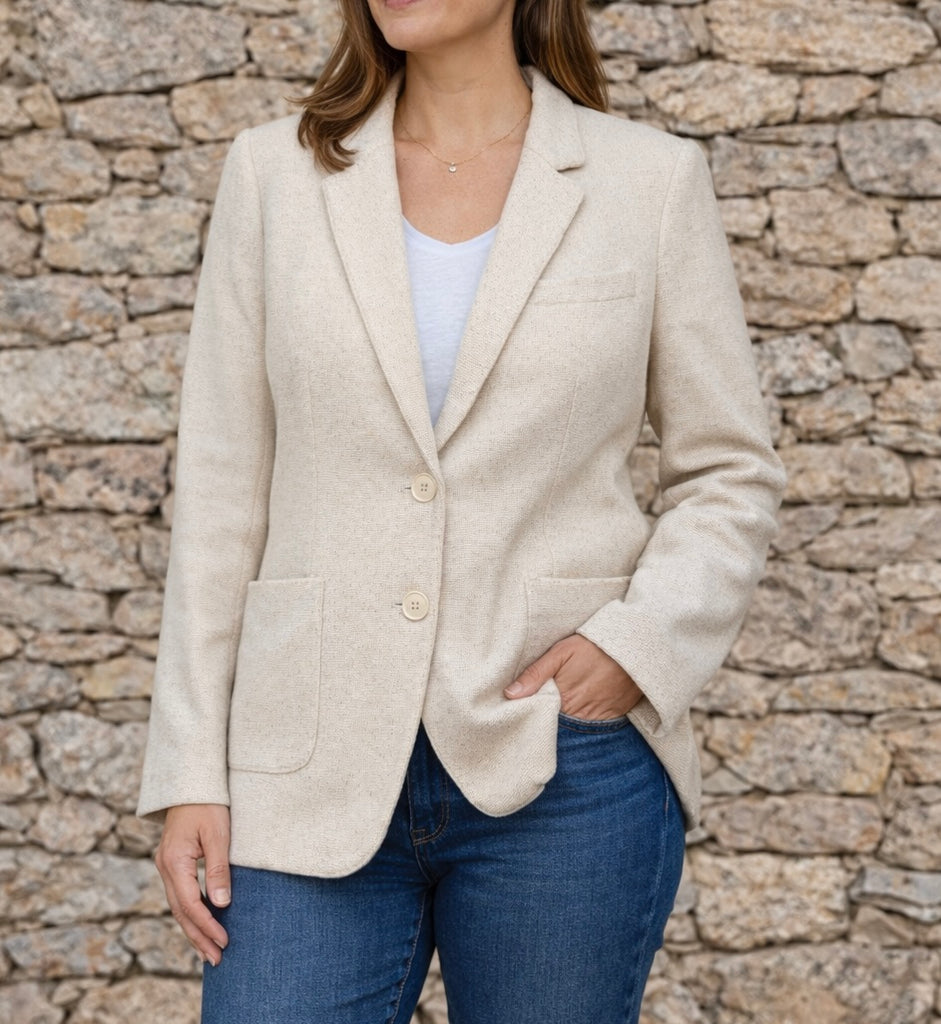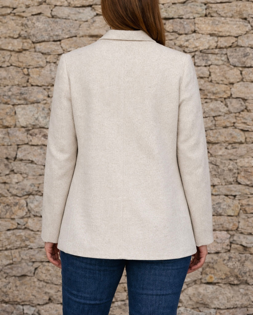 Très jolie veste blazer coloris écru (beige clair), avec une belle matière texturée imitant le lin et une coupe légèrement longue façon blazer.