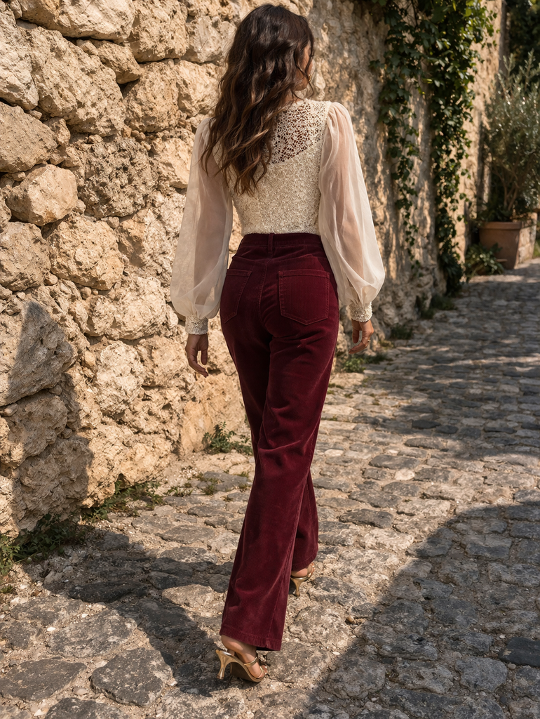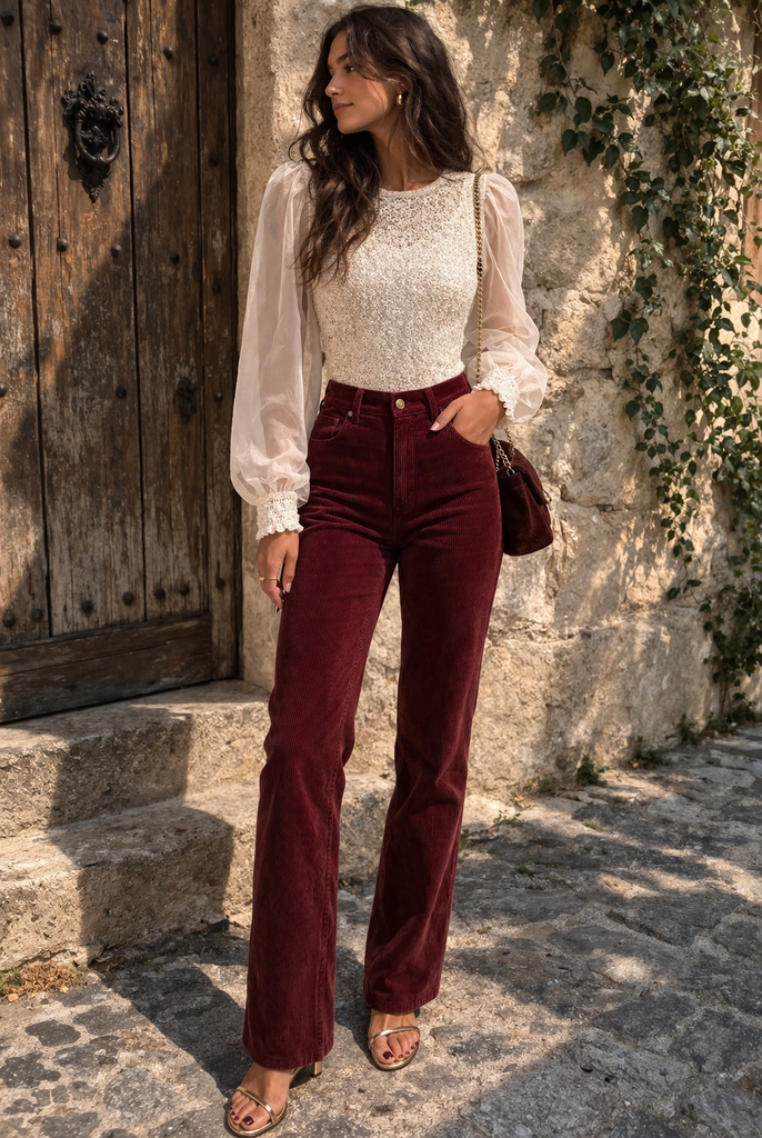 👖 Se porte parfaitement avec un pantalon taille haute (comme un velours côtelé bordeaux) ou une jupe pour un look tendance.