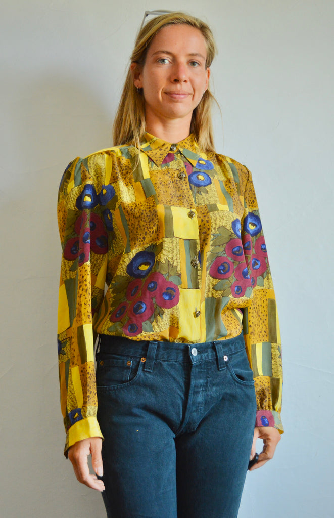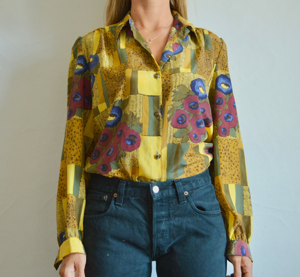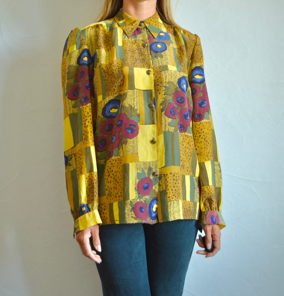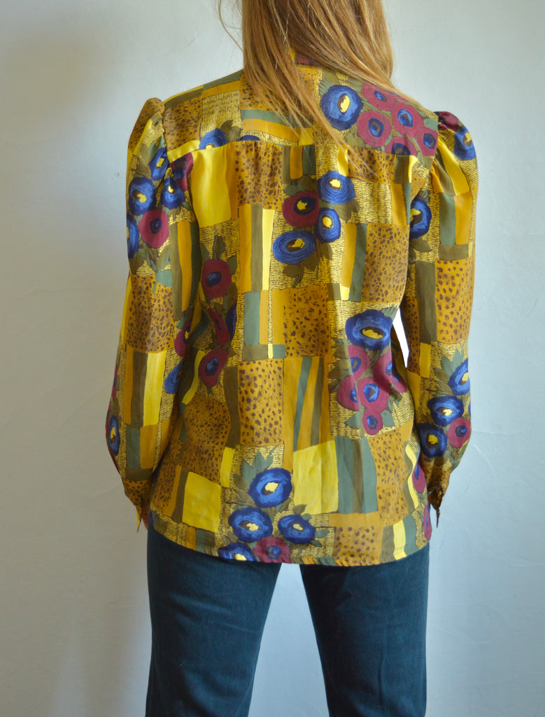 Imprimé fleuri discret, dans de jolies couleurs olives, prune, bleu marine. Les boutons argentés sont très chouettes. Petit rehaussement au dessus des épaules.