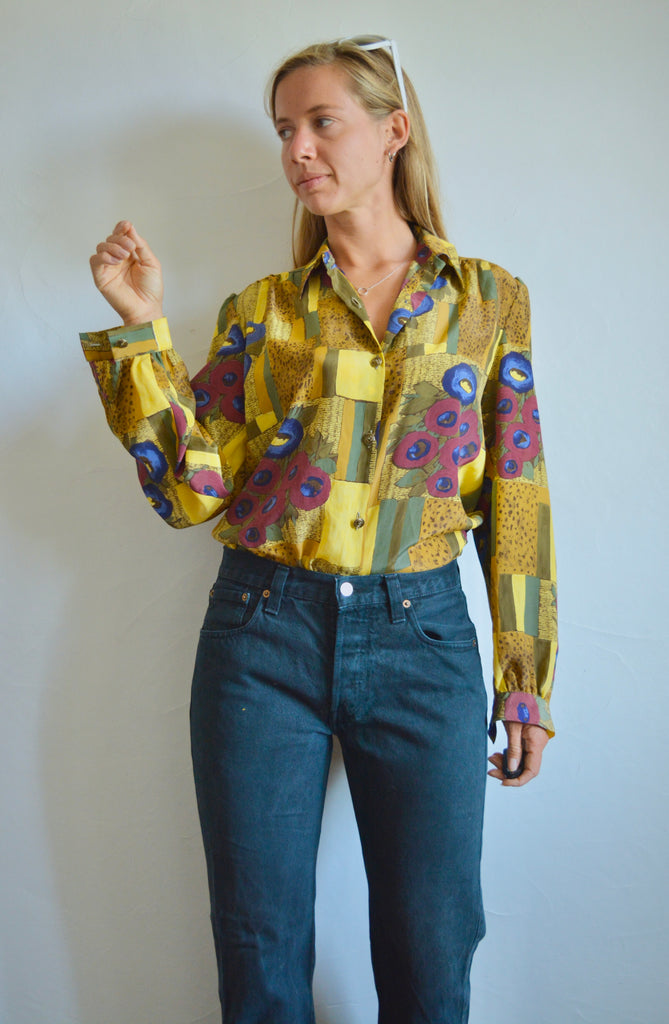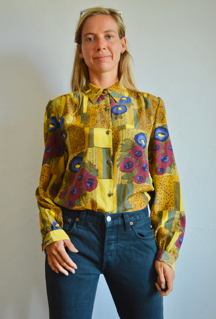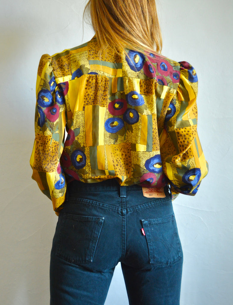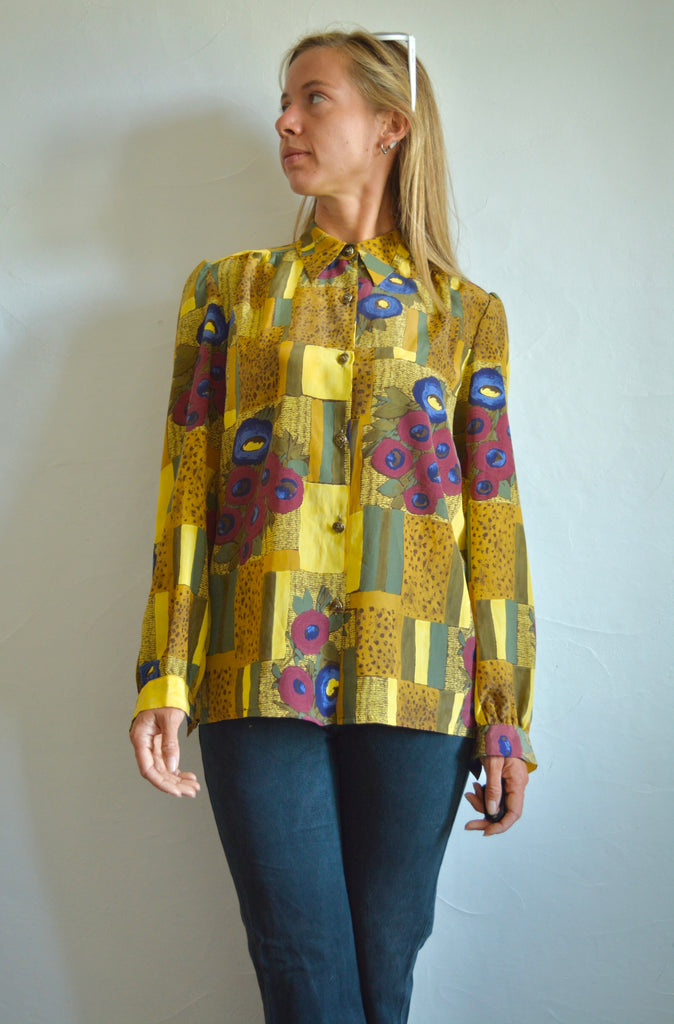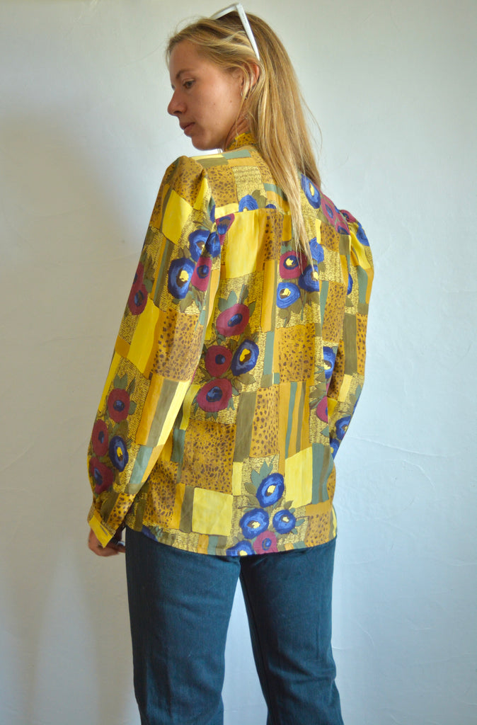 Imprimé fleuri discret, dans de jolies couleurs olives, prune, bleu marine. Les boutons argentés sont très chouettes. Petit rehaussement au dessus des épaules.