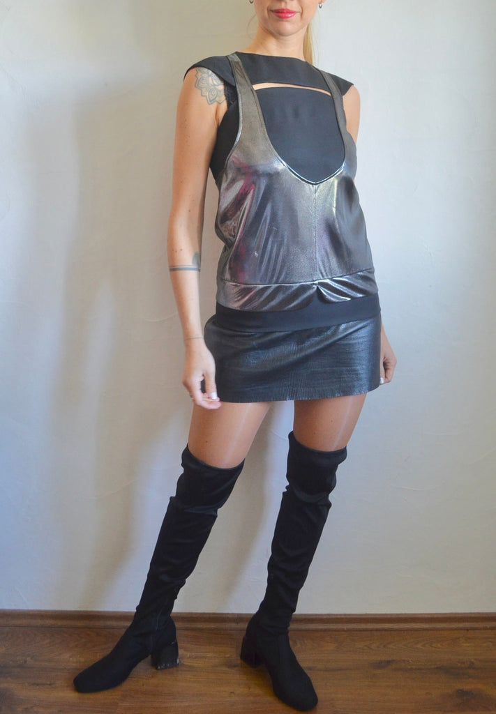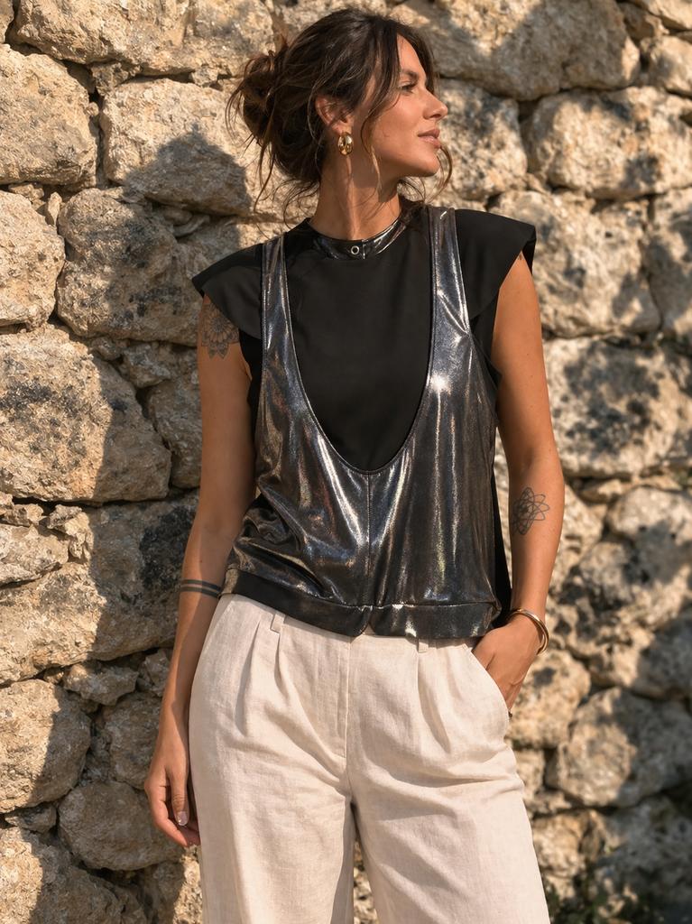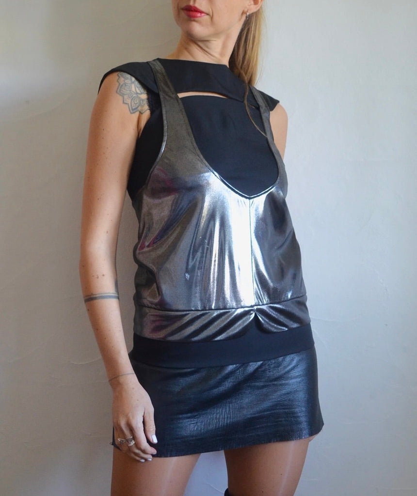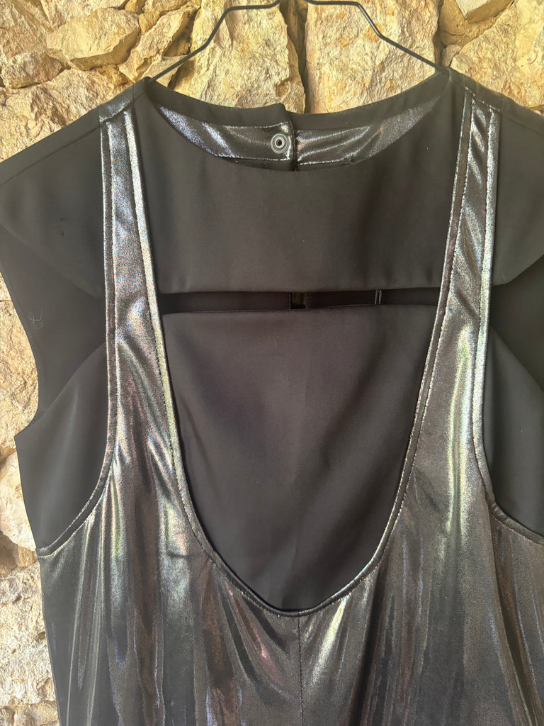 Noir et argenté, avec une fente sur l'avant et une coupe bien particulière.