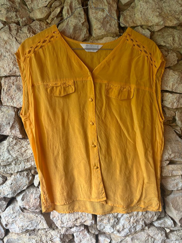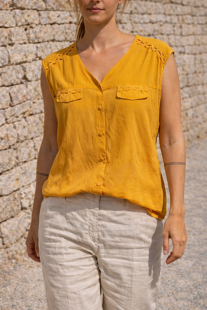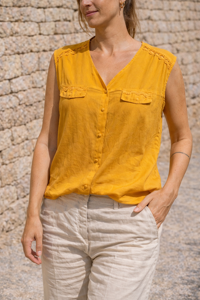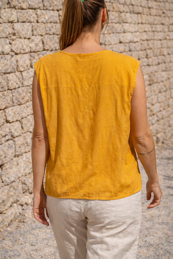 Joli haut sans manches coloris jaune moutarde, parfait pour les beaux jours ☀️