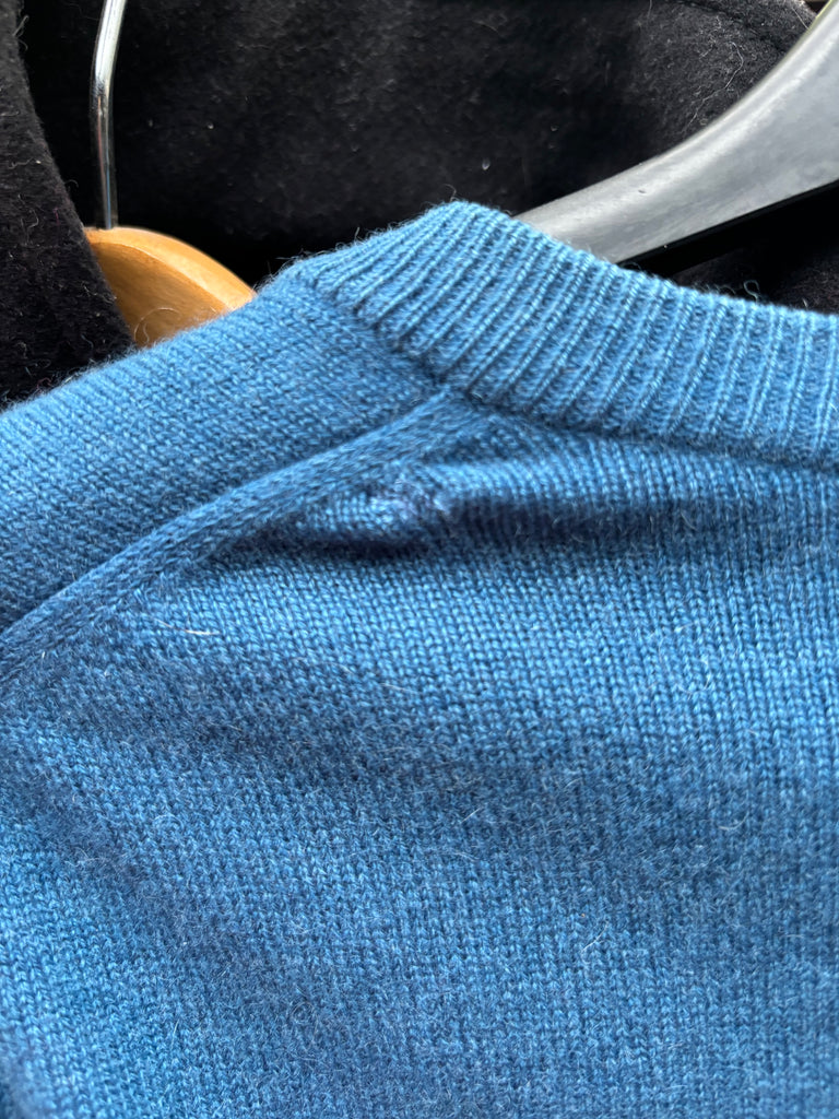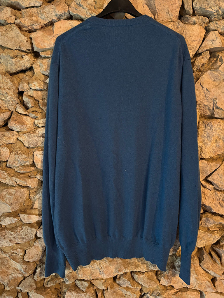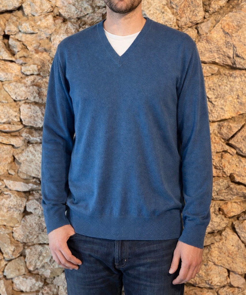 En cachemire, coloris bleu, col en V.