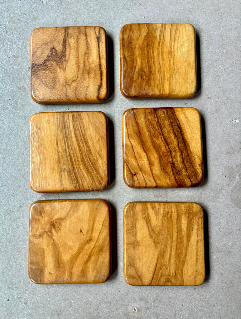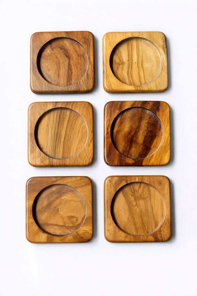 Modèles carrés aux bords arrondis, tous identiques en taille, avec de jolies veines naturelles du bois qui rendent chaque pièce unique.