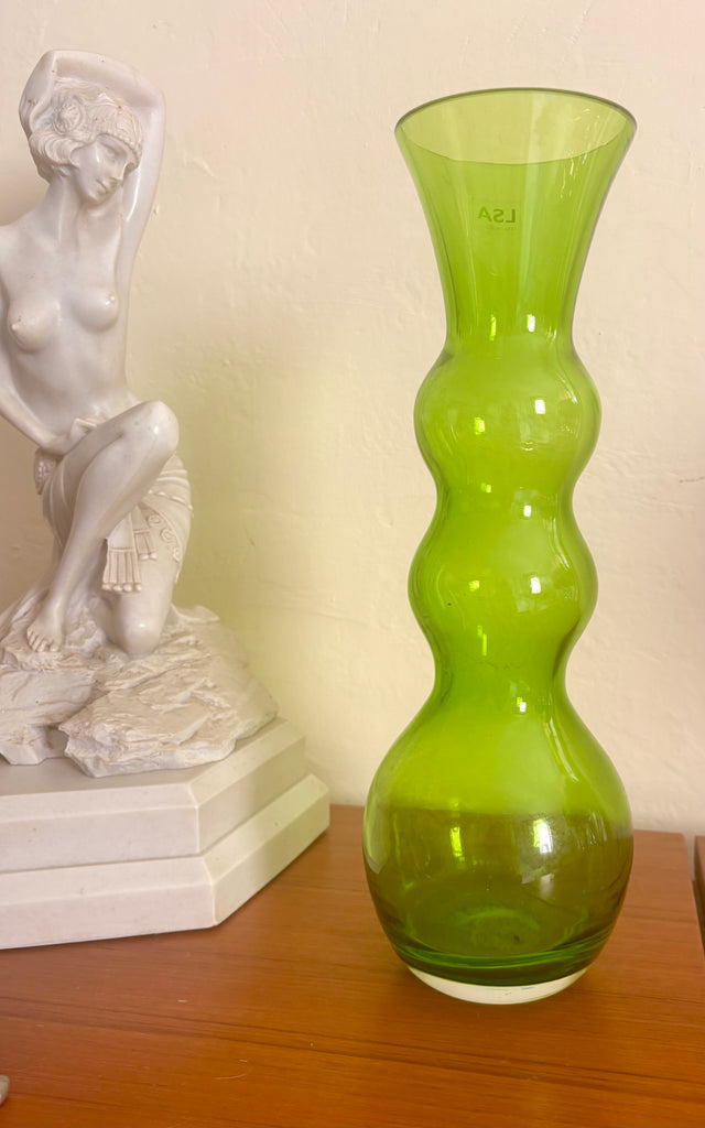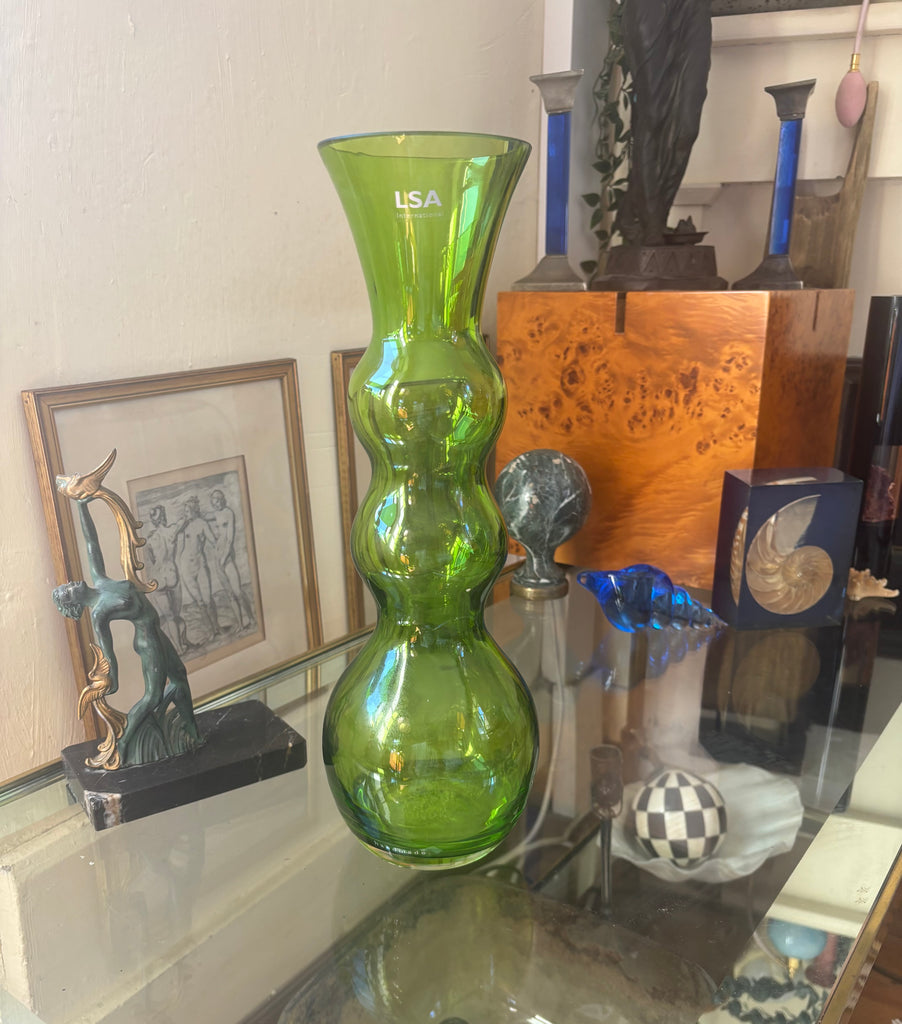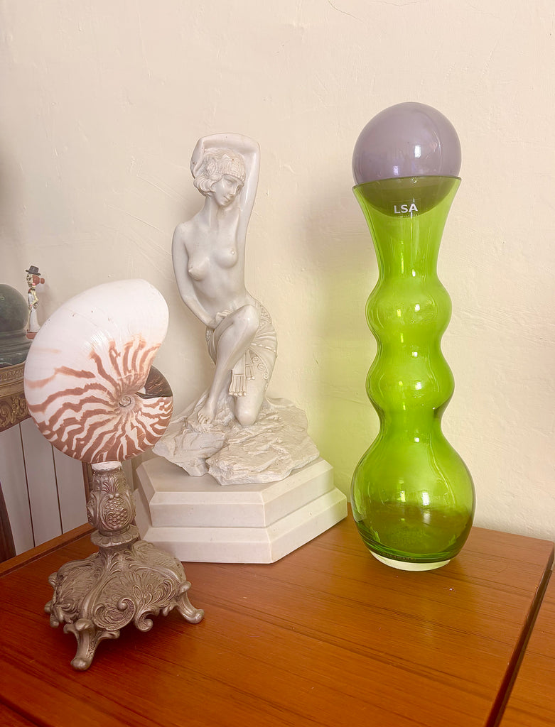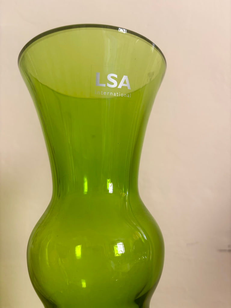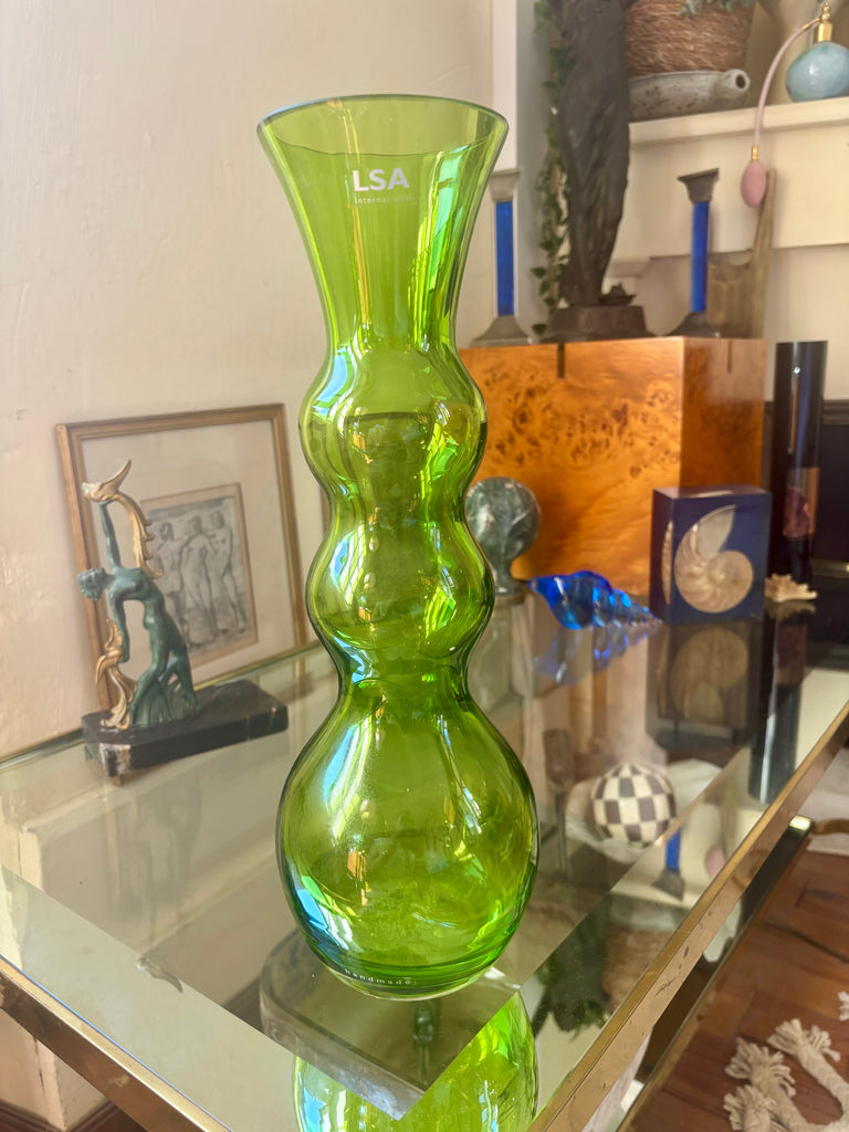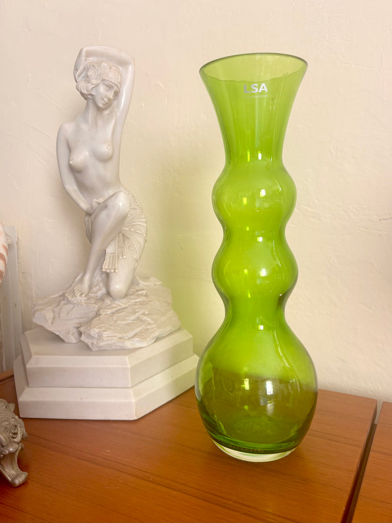 Sa forme élancée et organique à la silhouette ondulée, associée à une teinte verte lumineuse, en fait une pièce décorative forte, capable de mettre en valeur un simple bouquet comme de s’imposer seule en objet d’art.